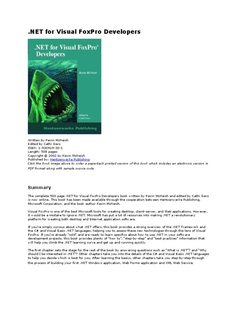 The complete 500 page .NET for Visual FoxPro Developers book written by Kevin McNeish and edited by Cathi Gero
