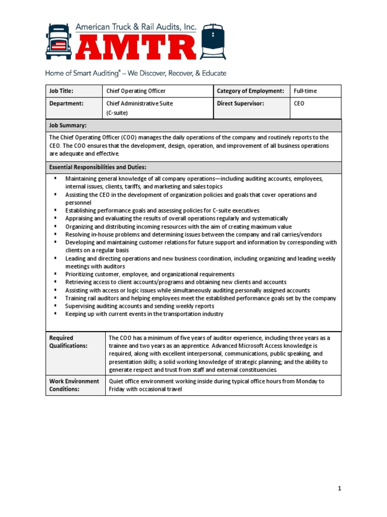Job Title: Chief Operating Officer Category of Employment: Full-time