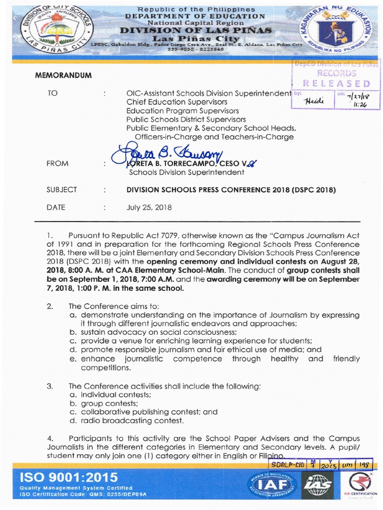 SUBJECT DIVISION SCHOOLS PRESS CONFERENCE 2018 (OSPC 2018)
