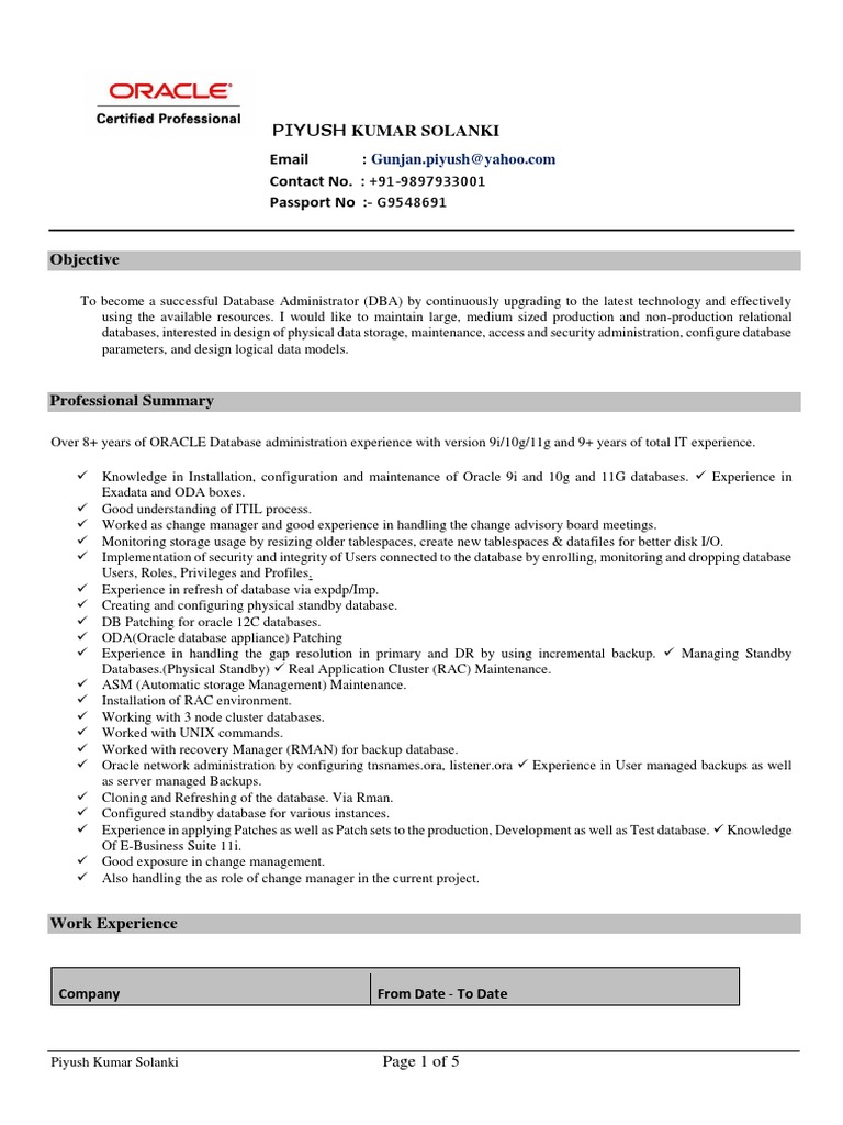 ✓ Experience in applying Patches as well as Patch sets to the production, Development as well as Test database. ✓ Knowledge