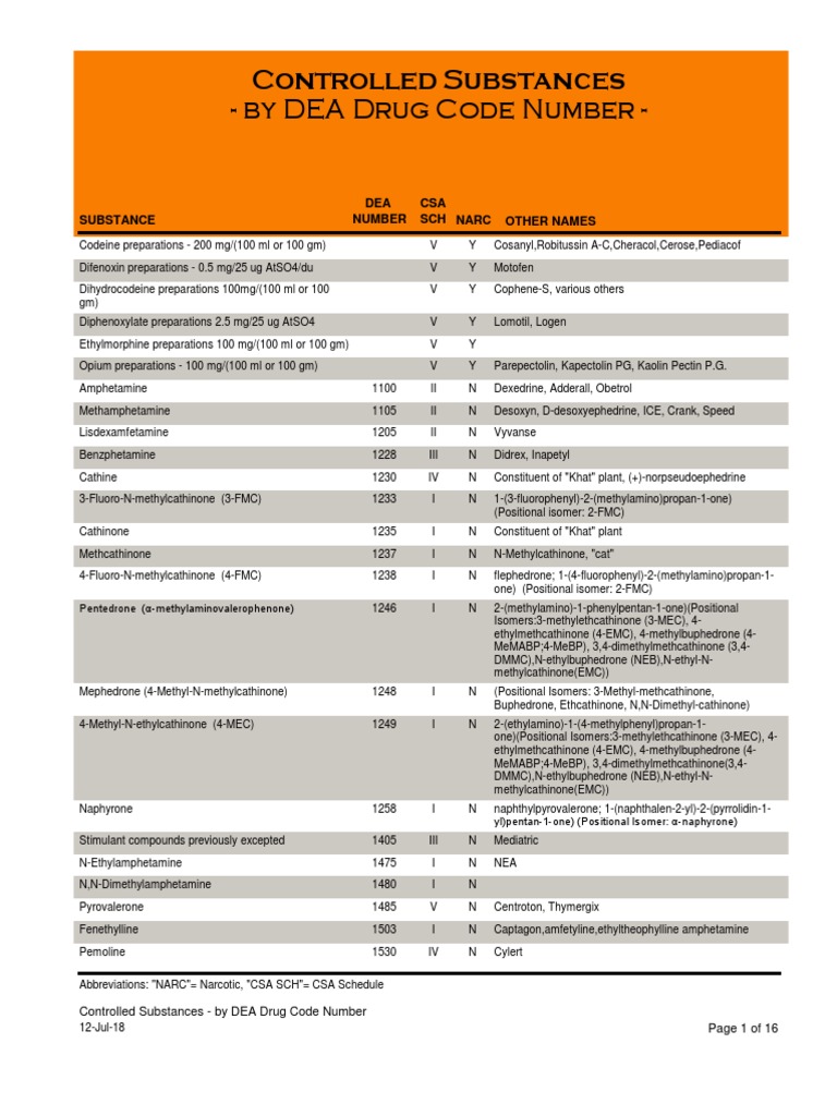 Abbreviations: "NARC"= Narcotic, "CSA SCH"= CSA Schedule