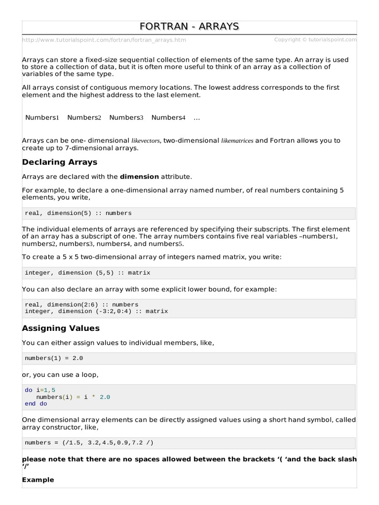 http://www.tutorialspoint.com/fortran/fortran_arrays.htm Copyright © tutorialspoint.com
