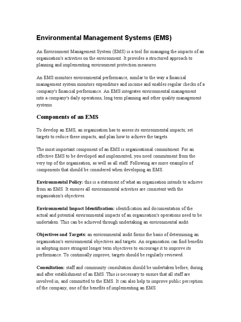 An Environment Management System (EMS) is a tool for managing the impacts of an
