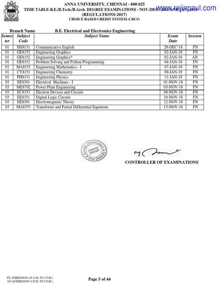 TIME TABLE-B.E./B.Tech./B.Arch. DEGREE EXAMINATIONS - NOV./DEC.-2018 AND JAN.-2019