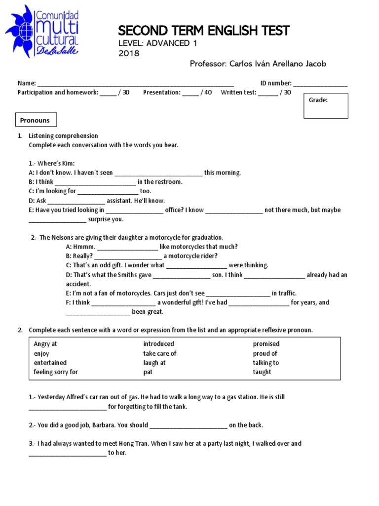 Participation and homework: _____ / 30 Presentation: _____ / 40 Written test: ______ / 30