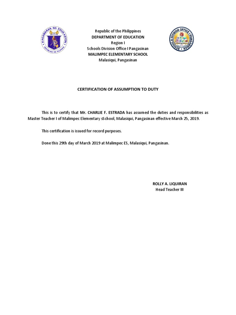 This is to certify that Mr. CHARLIE F. ESTRADA has assumed the duties and responsibilities as