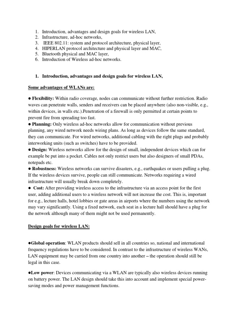 1. Introduction, advantages and design goals for wireless LAN,