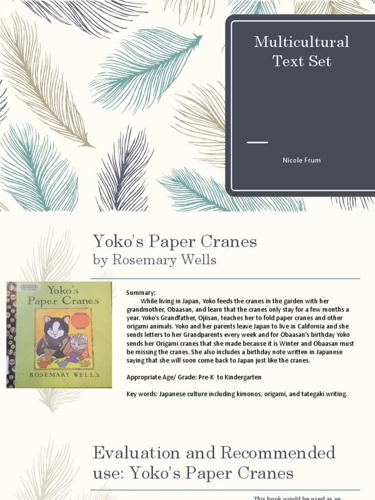 year. Yoko’s Grandfather, Ojiisan, teaches her to fold paper cranes and other