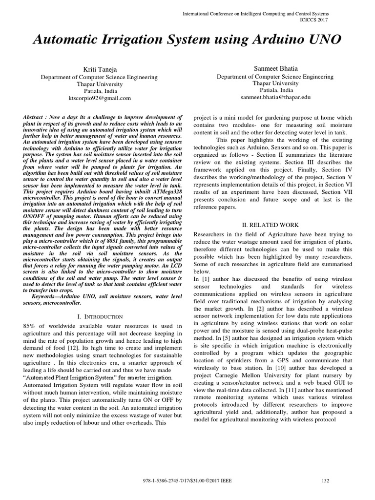 technology with Arduino to efficiently utilize water for irrigation technologies such as Arduino, Sensors and so on. This paper is