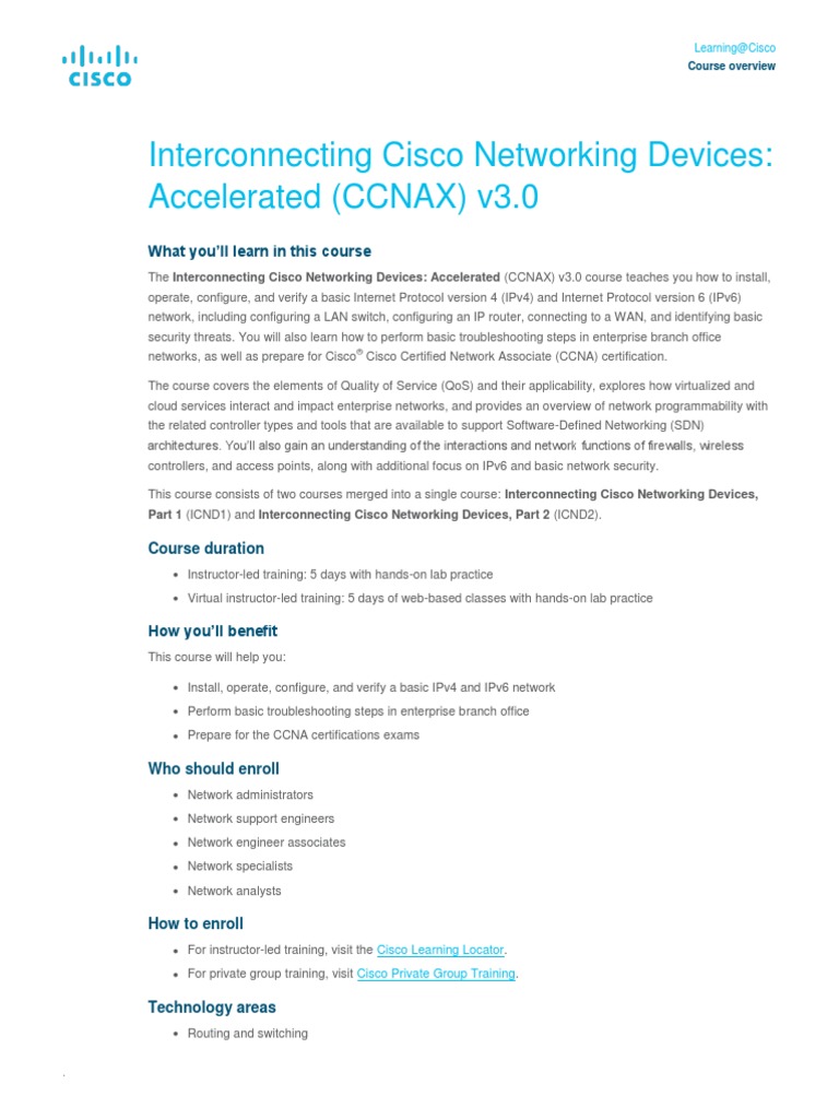 The Interconnecting Cisco Networking Devices: Accelerated (CCNAX) v3.0 course teaches you how to install,