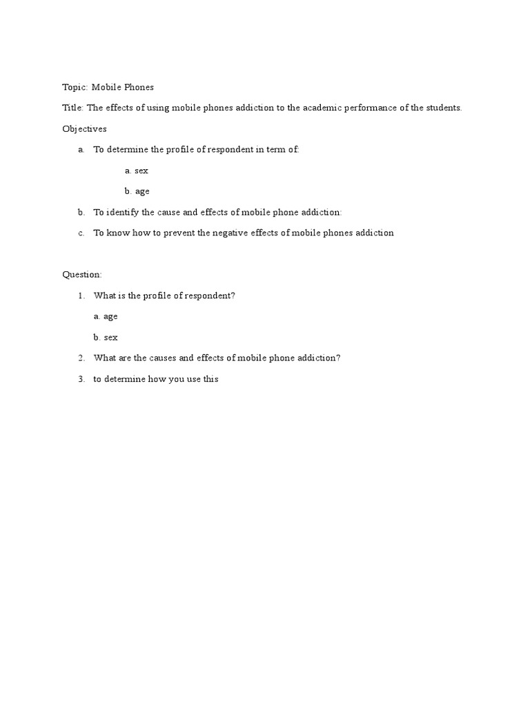 Title: The effects of using mobile phones addiction to the academic performance of the students.