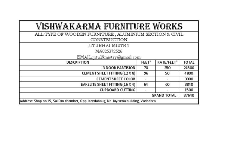 This document is an invoice from Vishwakarma Furniture Works listing various wood and construction items and their prices. It provides details of partition doors, cement and bakelite sheet fittings, cupboard cutting, and a grand total of 37,640 rupees. The contact information for Jitubhai Mistry is also included.