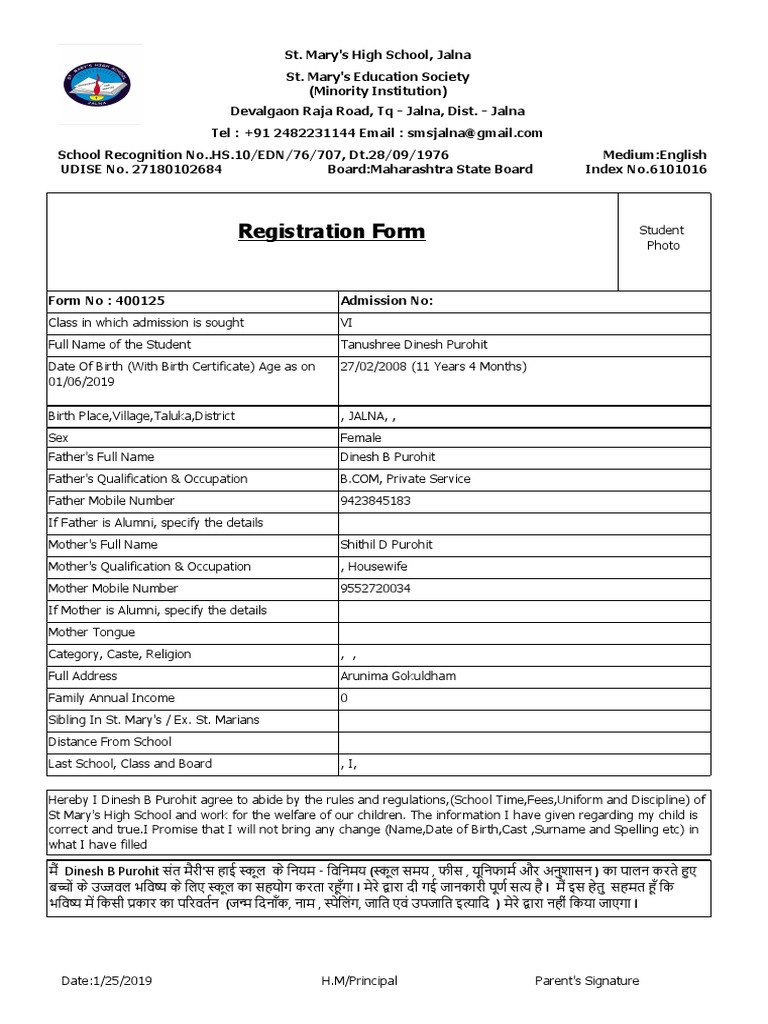 Hereby I Dinesh B Purohit agree to abide by the rules and regulations,(School Time,Fees,Uniform and Discipline) of