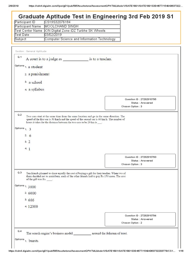 Graduate Aptitude Test in Engineering 3rd Feb 2019 S1