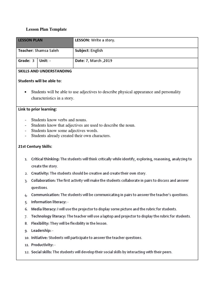 7. Technology literacy: The teacher will use a laptop and projector to display the rubric for students.
