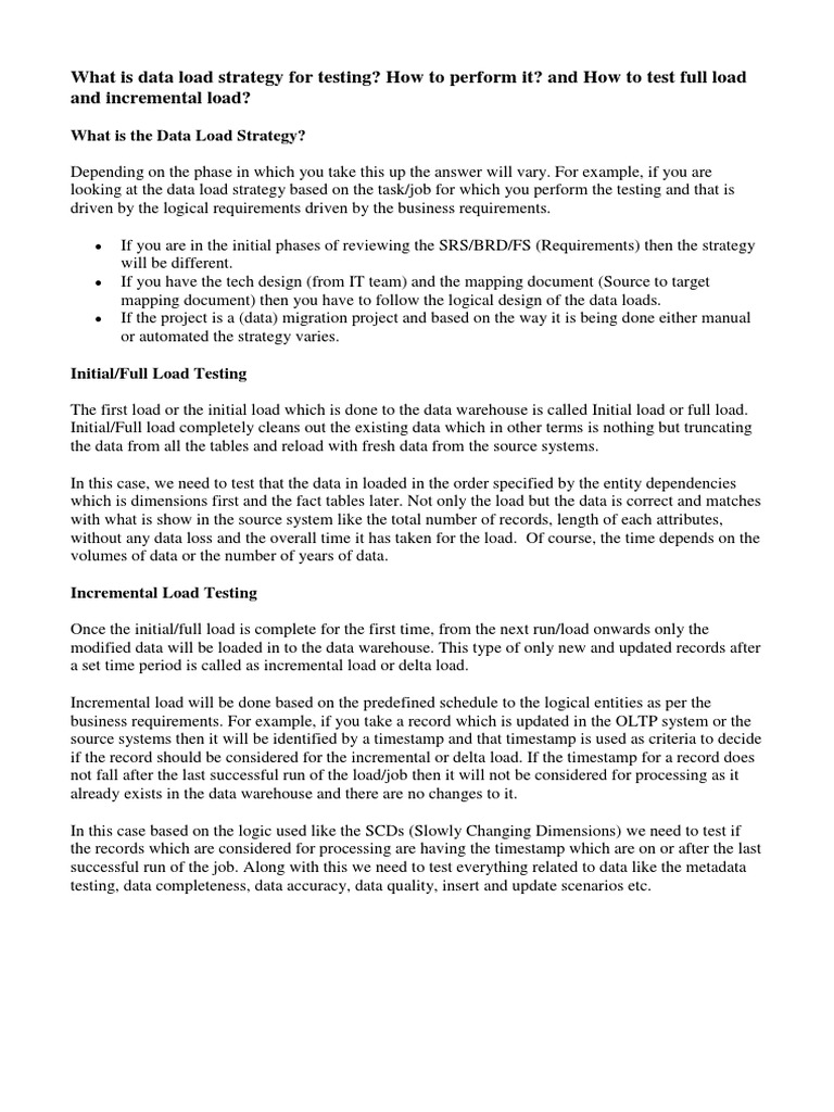 testing, data completeness, data accuracy, data quality, insert and update scenarios etc.