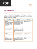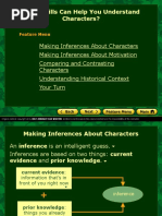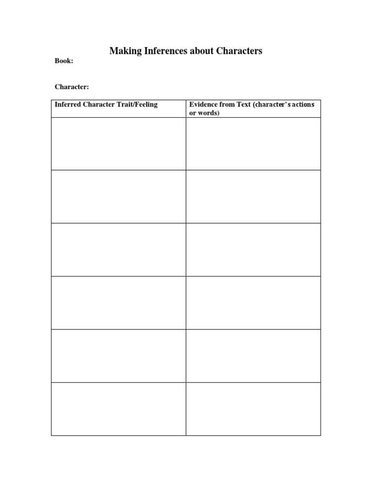 The document discusses how to make inferences about characters in books. It contains a template for analyzing characters with sections for the book title, character name, inferred character traits or feelings, and evidence from the text to support the inference. The template is used to analyze characters by filling in traits and feelings inferred about the character supported by their actions or words in the story.