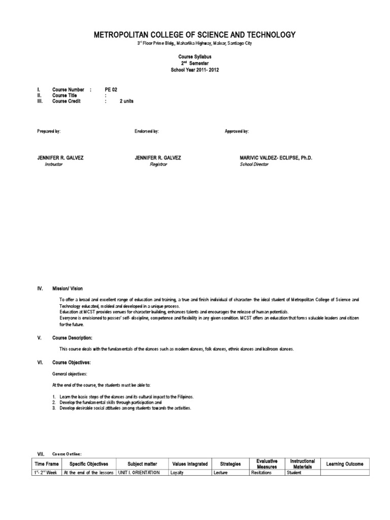 VII. Course Outline: