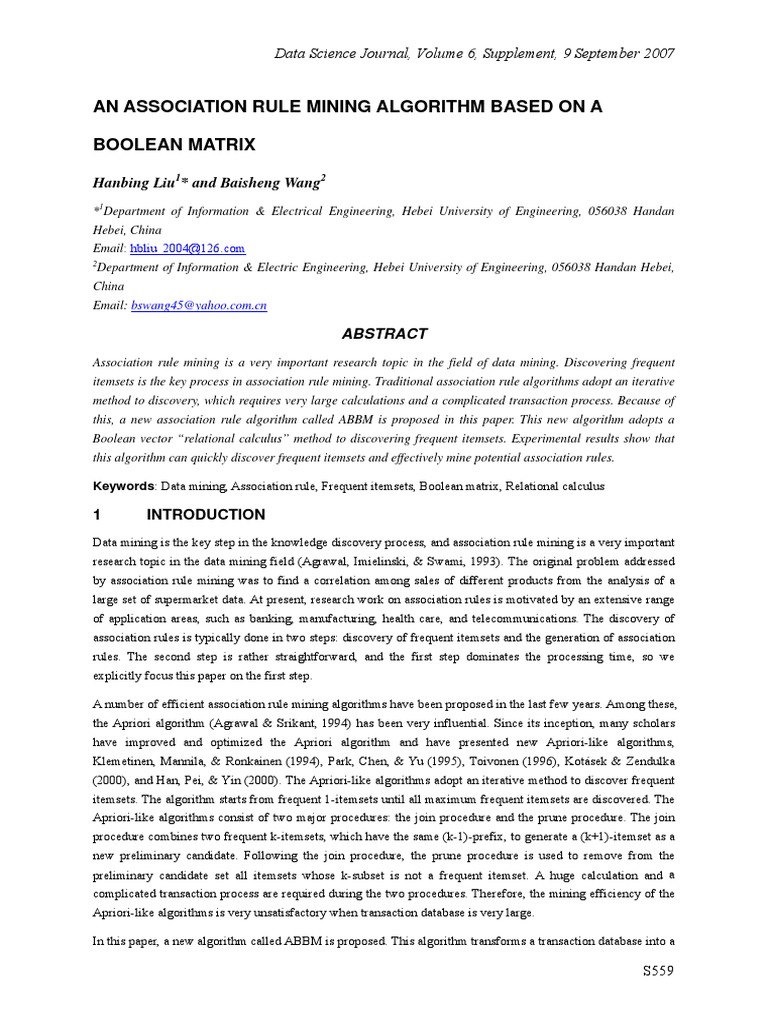 Keywords: Data mining, Association rule, Frequent itemsets, Boolean matrix, Relational calculus