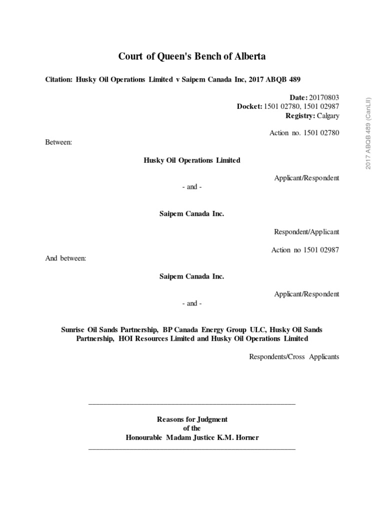 Citation: Husky Oil Operations Limited v Saipem Canada Inc, 2017 ABQB 489
