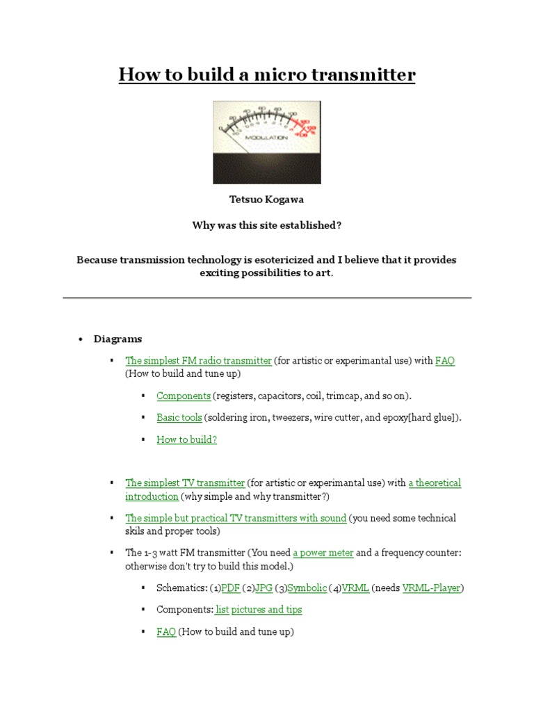 The 1-3 watt FM transmitter (You need a power meter and a frequency counter: