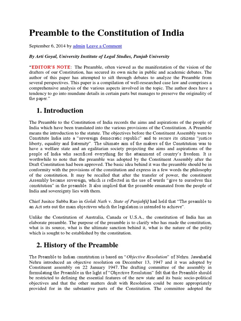 Preamble To The Constitution of India: by Arti Goyal, University Institute of Legal Studies, Panjab University