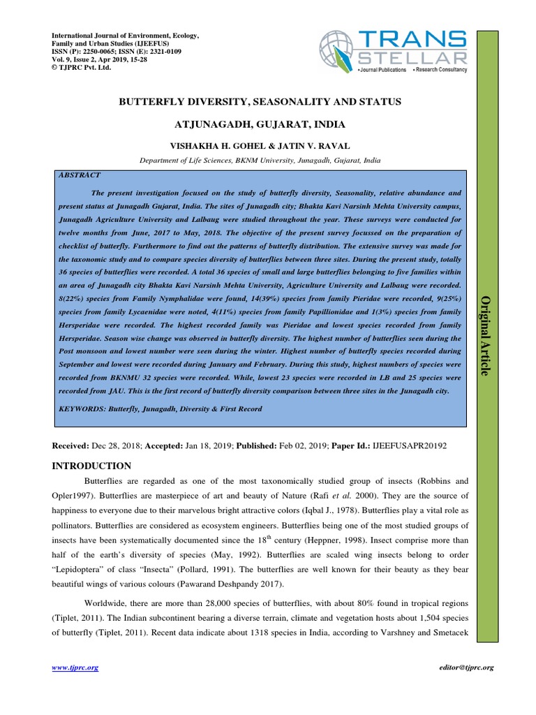 Butterfly Diversity, Seasonality and Status Atjunagadh, Gujarat, India