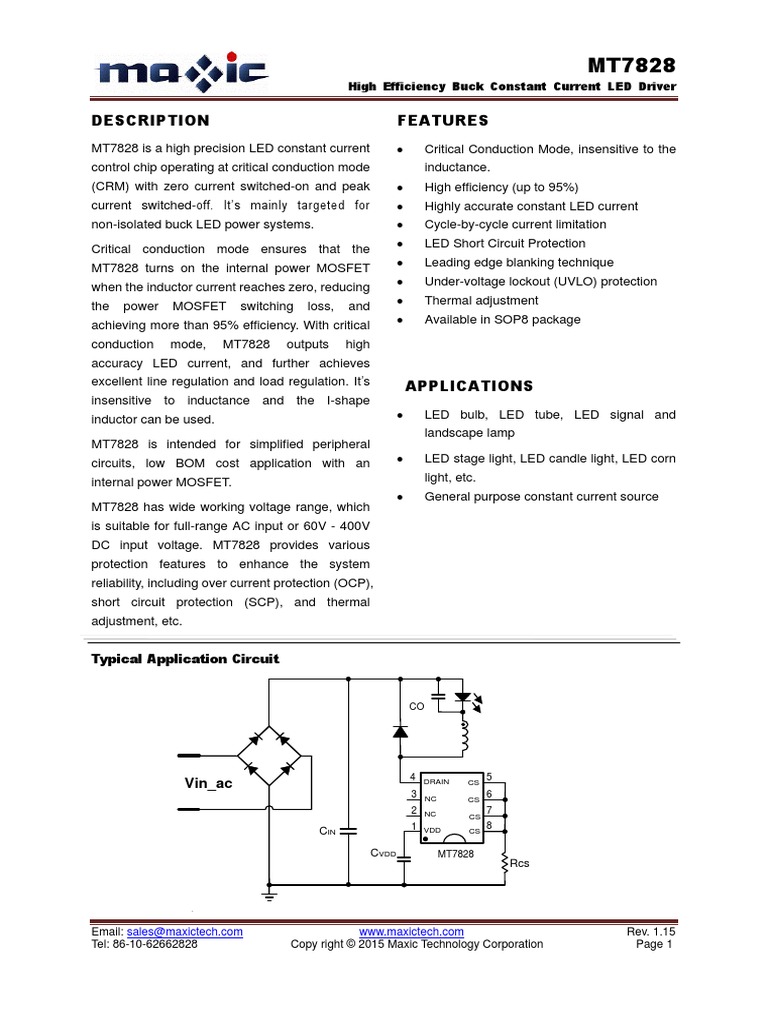 MT7828 is a high precision LED constant current Critical Conduction Mode, insensitive to the