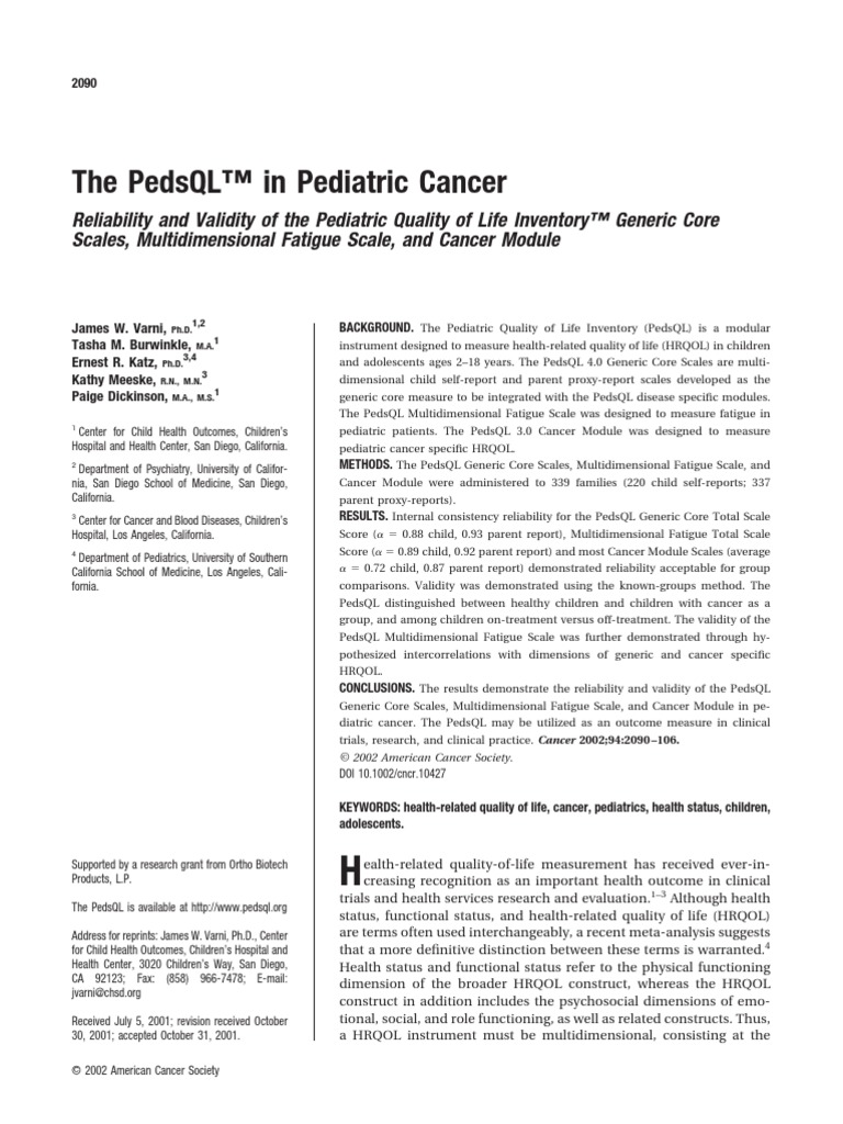 iterative process, the PedsQL 2.0 and 3.0 included addi- sures.24 –26 In pediatric cancer, the measurement of
