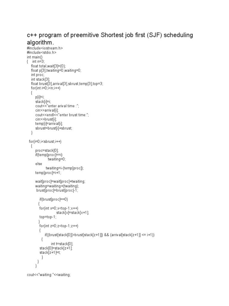 c++ program of preemitive Shortest job first (SJF) scheduling