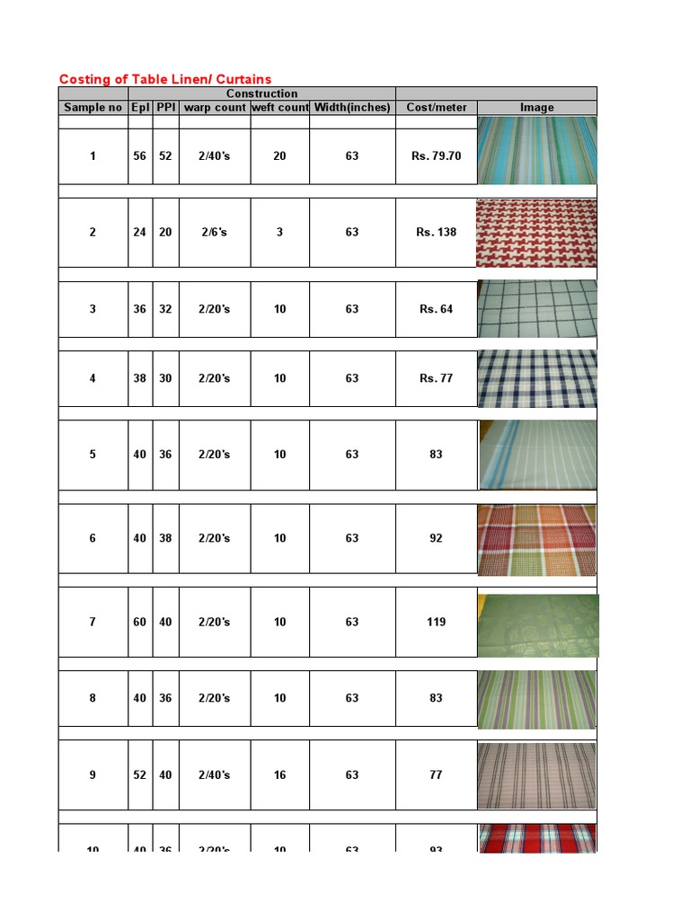 Cost Paramaters Samples Warp Count Weft count reed count PPI Reed width
