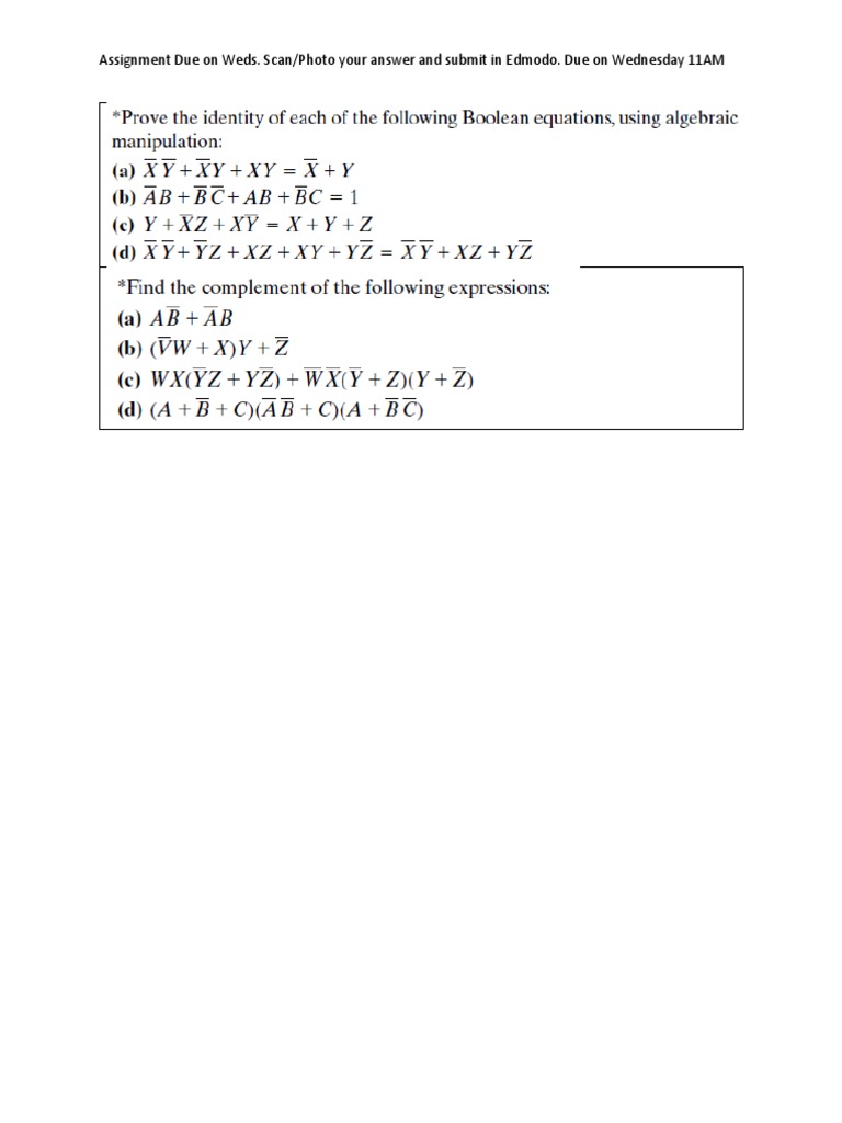 This document provides instructions for an assignment that is due on Wednesday at 11AM. Students are asked to scan or take a photo of their completed assignment and submit it through the Edmodo platform by the due date and time. The assignment itself is not specified in the instructions.