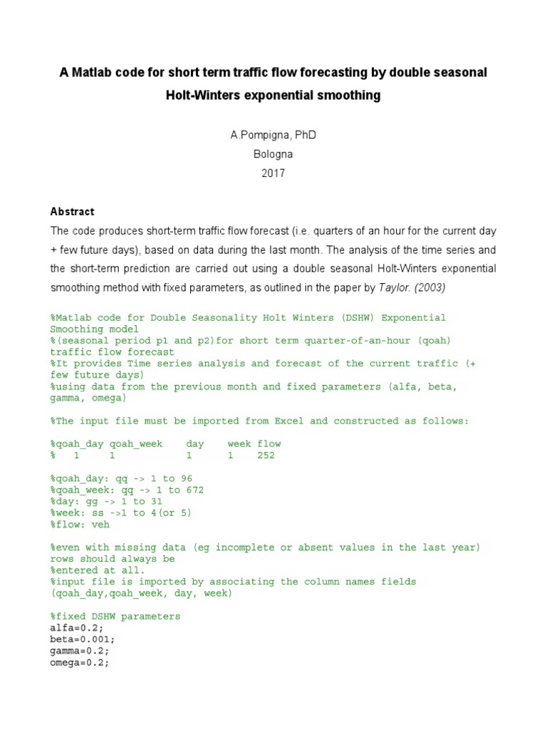 A Matlab code for short term traffic flow forecasting by double seasonal