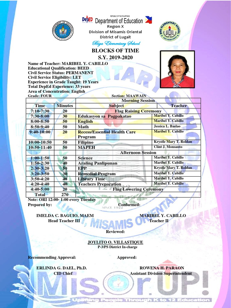 1:50-2:30 40 Araling Panlipunan Maribel Y. Cabillo