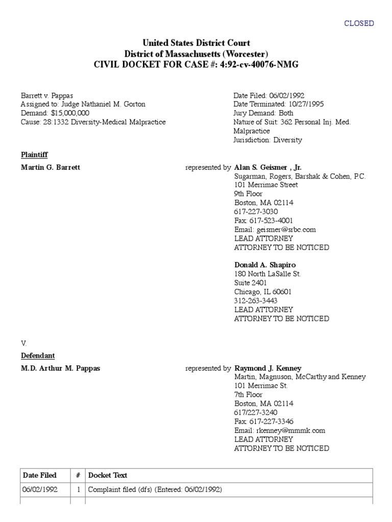 Description: Docket Report Search 4:92-cv-40076-