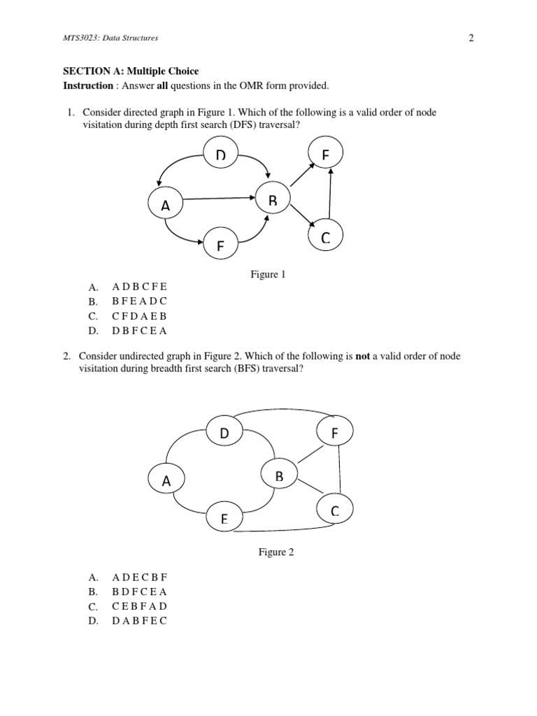 2. Consider undirected graph in Figure 2. Which of the following is not a valid order of node