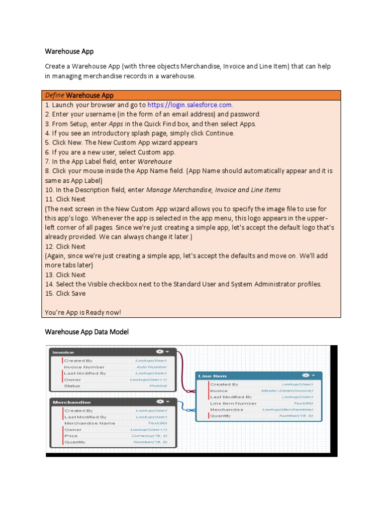 Create a Warehouse App (with three objects Merchandise, Invoice and Line Item) that can help
