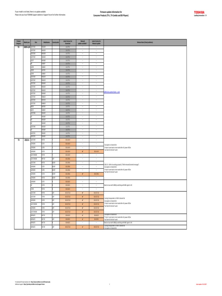 Please visit your local TOSHIBA Support website or Support Forum for further information. Consumer Products (TV's, TV-Combis and BD-Players)