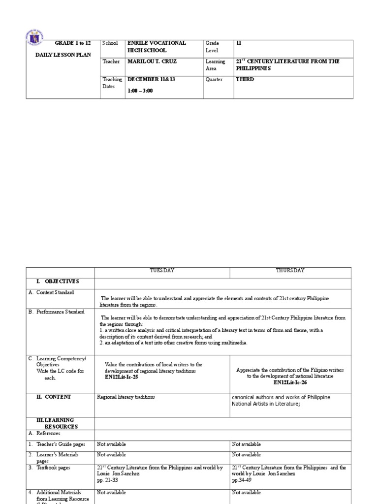 The learner will be able to demonstrate understanding and appreciation of 21st Century Philippine literature from