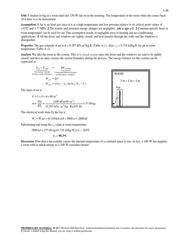 4-64 A student living in a room turns her 150-W fan on in the morning. The temperature in the room when she comes back