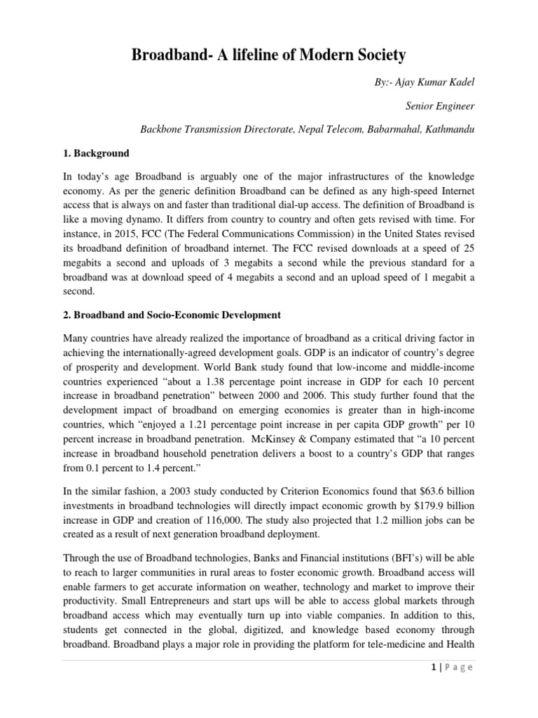 economy. As per the generic definition Broadband can be defined as any high-speed Internet