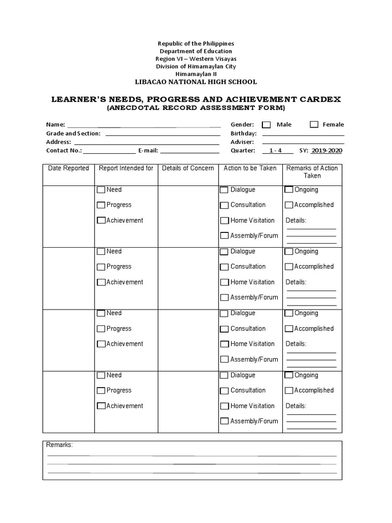 (ANECDOTAL RECORD ASSESSMENT FORM)