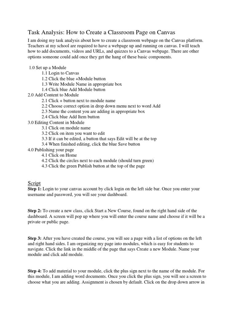 I am doing my task analysis about how to create a classroom webpage on the Canvas platform.
