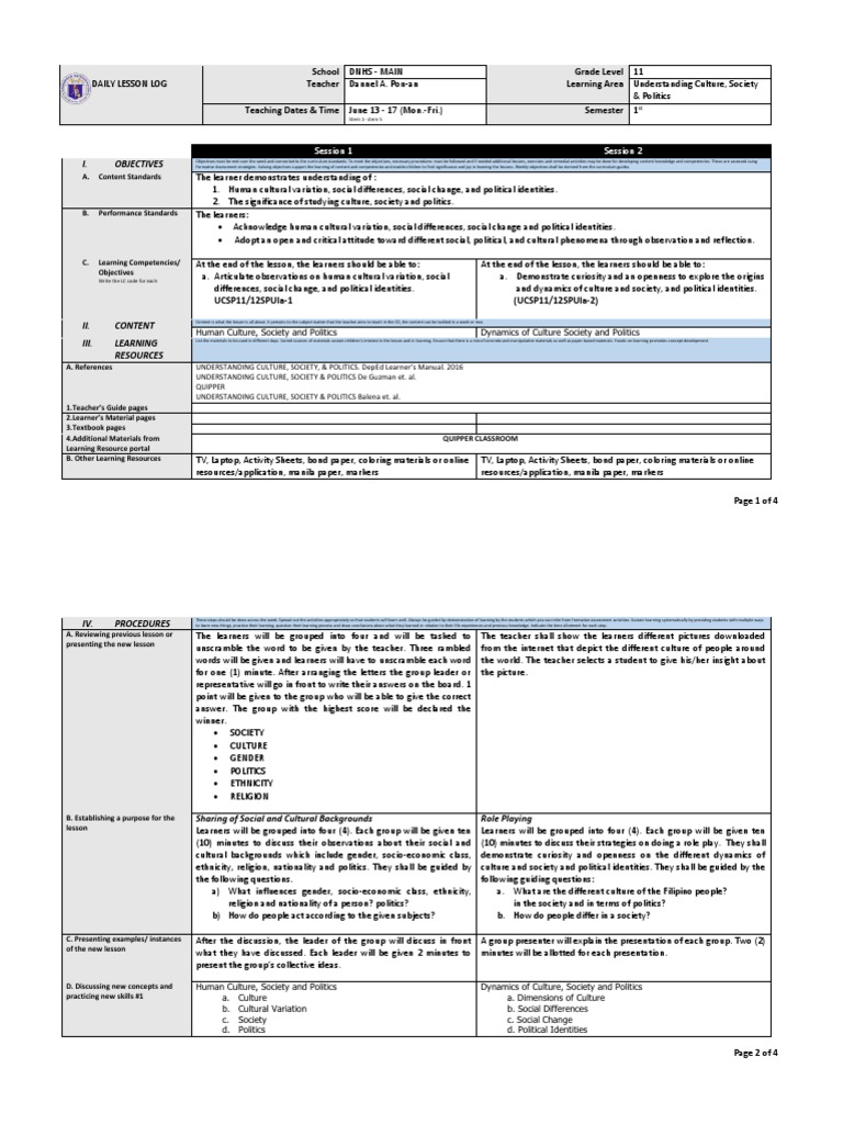 DAILY LESSON LOG Teacher Dannel A. Pon-an Learning Area Understanding Culture, Society