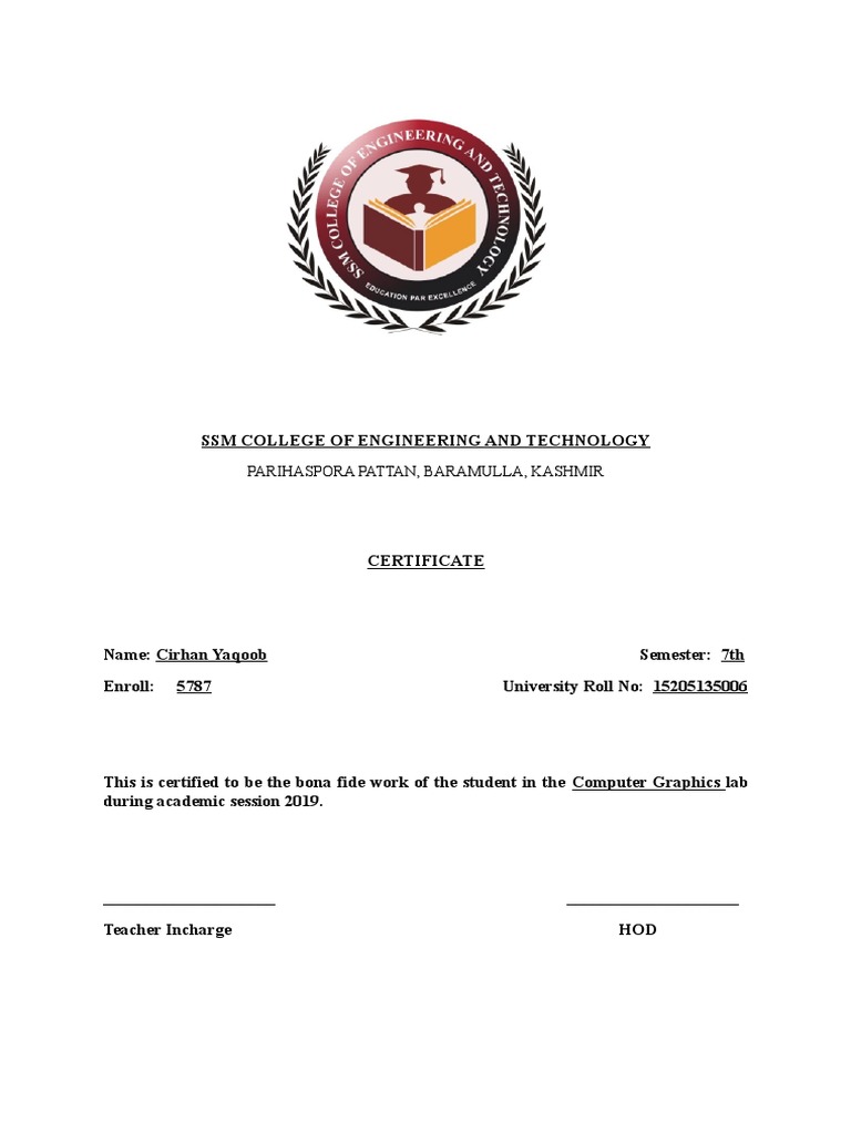 This is certified to be the bona fide work of the student in the Computer Graphics lab