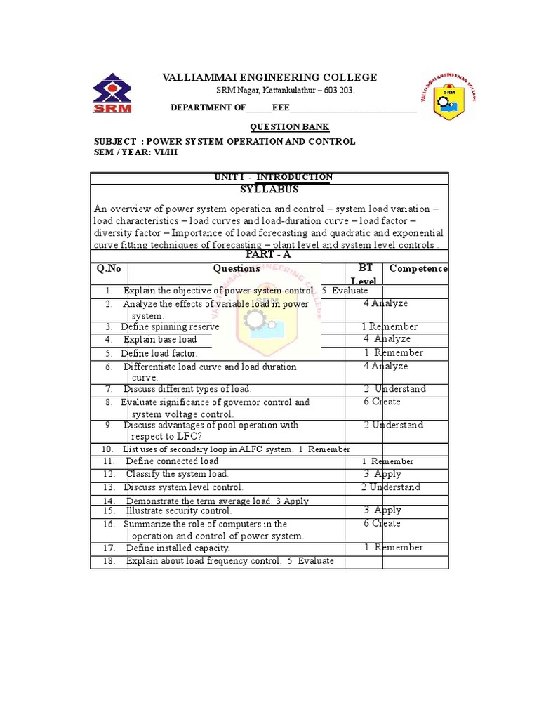 SUBJECT : POWER SYSTEM OPERATION AND CONTROL