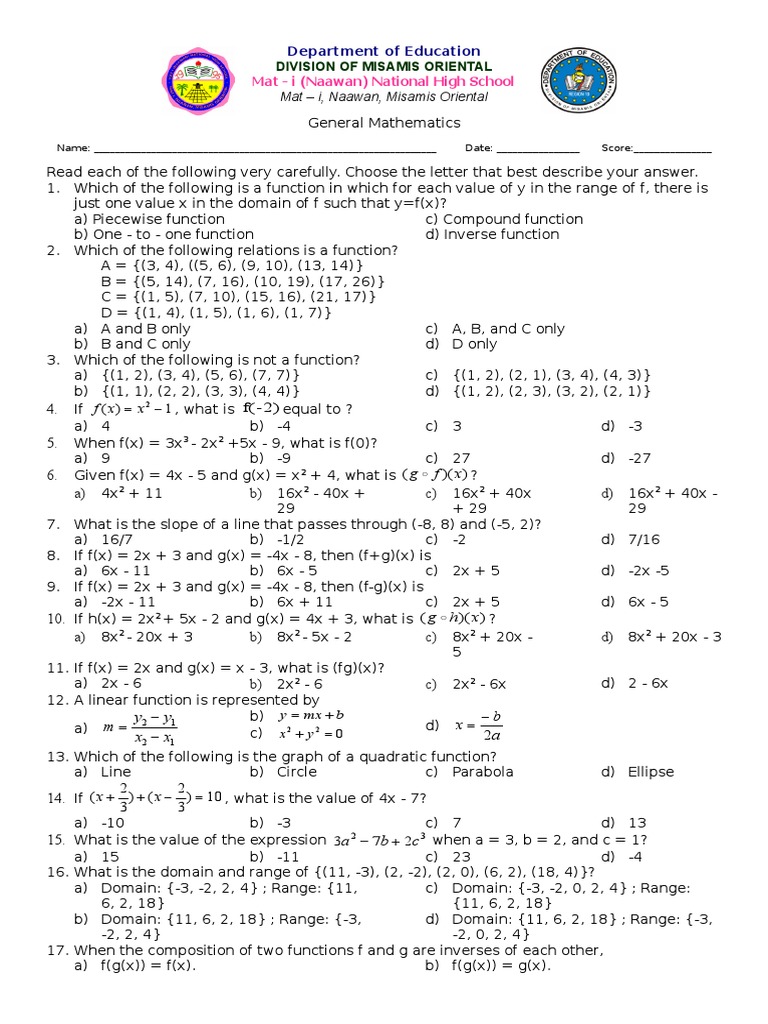 10. If h(x) = 2x2 + 5x - 2 and g(x) = 4x + 3, what is ( g h)( x ) ?