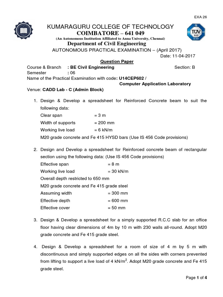1. Design & Develop a spreadsheet for Reinforced Concrete beam to suit the