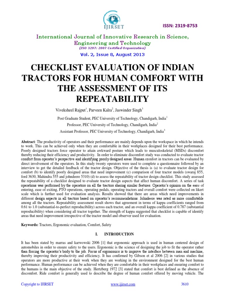 overall comfort. It was found that tractor design checklist contains excellent repeatability when used among all the