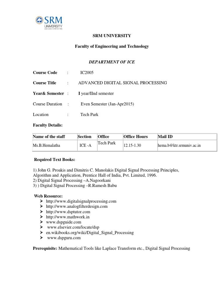 Course Title : ADVANCED DIGITAL SIGNAL PROCESSING